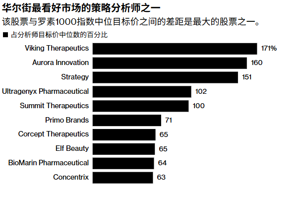 因此,相较于当前股价,市场对 Strategy 的乐观情绪在美国大型公司中显得尤为突出。其目标价中位数所对应的涨幅,在纳斯达克 100 指数成分股中独占鳌头、位列第一;即便在罗素 1000 指数中,也仅落后于生物科技集团 Viking Therapeutics Inc.(VKTX.US)和自动驾驶技术公司 Aurora Innovation Inc.(AUR.US),而罗素 1000 指数成分股当前股价与分析师目标价中位数的平均差距仅为 17%。值得一提的是,Strategy 的最高目标价近乎是最低目标价的四倍。