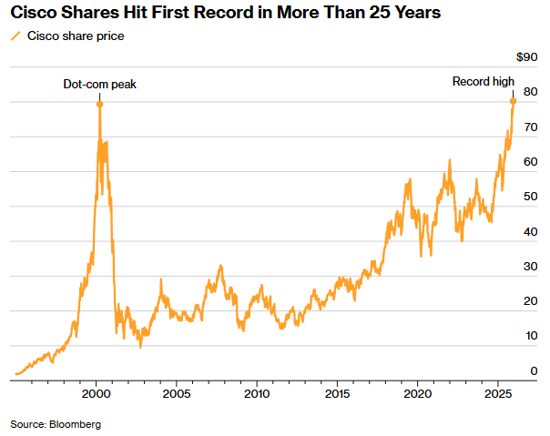智通财经APP获悉,作为互联网技术革命风向标股票的思科(CSCO.US)在历经四分之一个世纪后终于重返历史高点,这场股价攀升部分得益于人工智能支出热潮的推动。