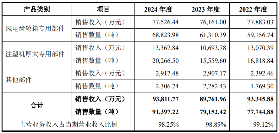 招股书披露,锡华科技主要从事大型高端装备专用部件的研发、制造与销售,产品结构以风电齿轮箱专用部件为主、注塑机厚大专用部件为辅,是全球行业领先、质量可靠、技术卓越的大型高端装备专用部件制造商。公司产品主要应用于大型风电装备与注塑机领域,公司是国内少数可提供风电齿轮箱专用部件全工序服务的企业。
