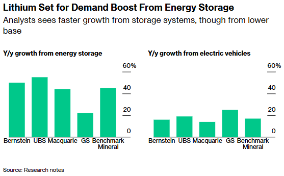 瑞银分析师表示,中国有望超过到2027年累计储能容量达180吉瓦的新目标,而在美国,此类储能系统被视为"解决日益增长的电力供需失衡的有吸引力的解决方案"。他们的数据显示,明年该领域对锂的需求可能增长55%,而电动汽车领域的增长仅为19%。
