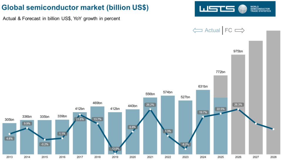 WSTS预计继2024年强劲反弹之后,2025年全球半导体市场将增长22.5%,总价值将达到7722亿美元,高于WSTS春季给出的展望;2026年半导体市场总价值则有望扩张至9755亿美元,接近SEMI预测的2030年1万亿美金的市场规模目标,意味着有望同比大增26%。