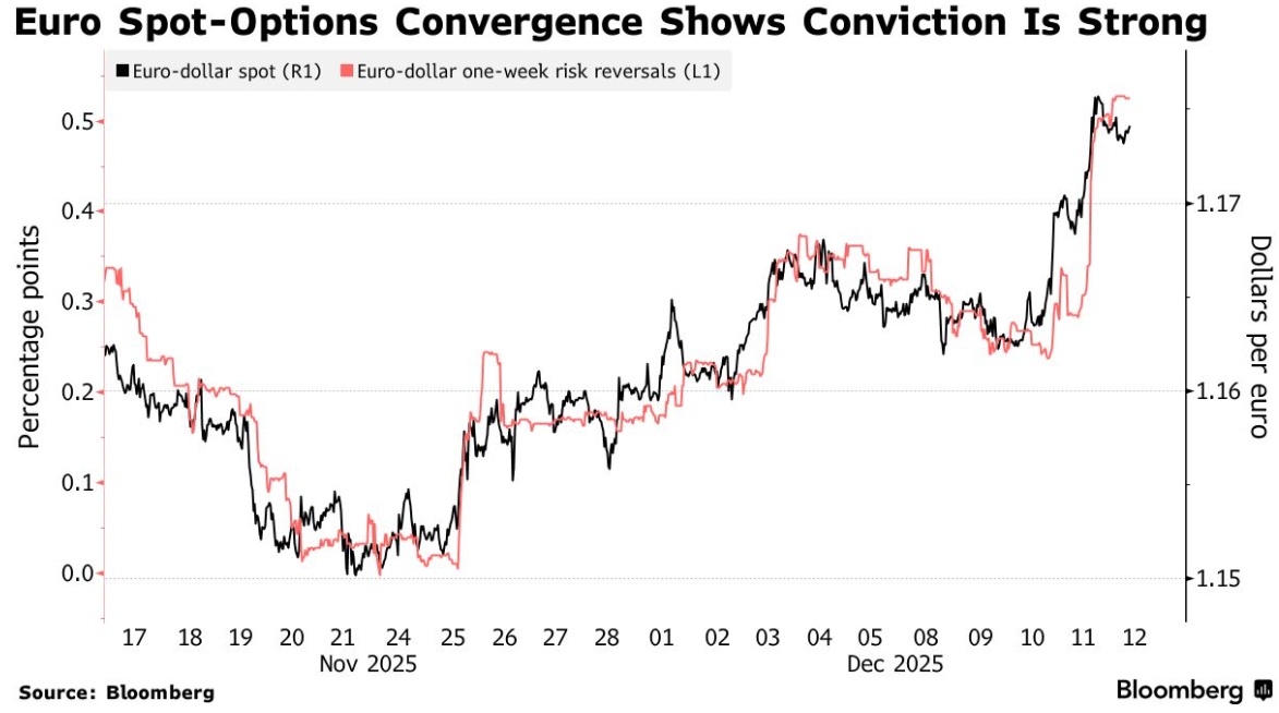 据存款信托和清算公司(DTCC)的统计数据显示,本月交易最活跃的行权价位于每欧元 1.18 美元,其中基础价值的绝大部分集中在 12 月 18 日至 19 日(欧洲央行利率决议窗口期)到期的合约。这些资金流向表明,到决策者完成会议时,欧元汇率将交投于该水平之上。