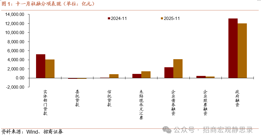 十一月,社融新增24885亿,同比多增1597亿,超出wind平均预期。五大构成上,实体部门信贷、政府债、企业股票融资同比减少,企业债融资、“非标”同比大幅多增。具体来看,当月企业债融资4169亿元(上年同期2381亿),其中产业债融资3784.77亿(上年同期约2378.71亿),其贡献了企业债同比增幅的79%;“非标”融资2146亿(上年同期818亿),其中未贴现承兑汇票融资1490亿(上年同期910亿),信托贷款844亿(上年同期91亿),委托贷款基本持平。同比少增部分,实体部门信贷同比少增1163亿,降幅较上月明显收窄;政府债同比少增1048亿,主要受地方债的拖累。总体来看,当月社融新增超出市场平均预期,主要是实体部门信贷偏强,其它项目则差距不大。