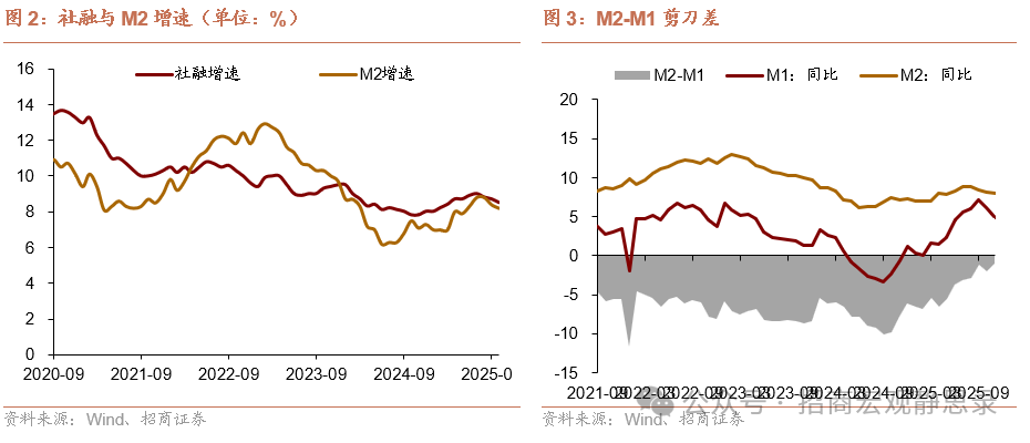 广义货币供应量上,M1与M2增速同步下滑。其中,M1增速较上月下滑1.3个百分点,较上月进一步加快,主要受高基数的影响;M2增速较上月下滑0.2个百分点,降幅与上月持平。M1-M2剪刀差边际走阔,资金活化的趋势有所放缓。
