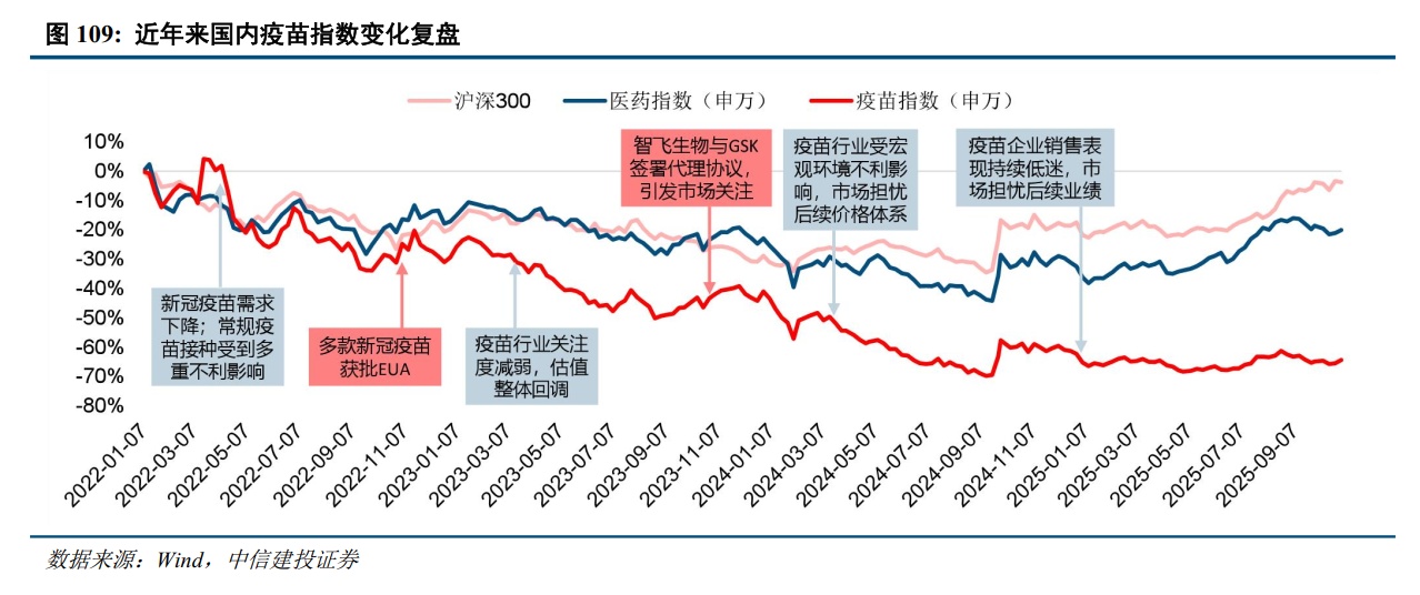 疫苗行业历经多年发展,2024年至今持续承压。中国疫苗行业历经多年发展,曾经以免疫规划疫苗为主,2019年以前发生过多起负面事件,影响行业发展。随着国家持续加强疫苗行业监管,影响行业的不利因素阶段性出清,叠加国产重磅疫苗产品上市并逐步放量,非免疫规划市场逐渐成为驱动疫苗行业发展的重要因素。2023年,疫苗行业关注度有所减弱,部分企业依靠新上市产品或重磅产品持续放量,经营业绩持续增长。2024年,受市场宏观环境影响,疫苗销售渠道短期承压,叠加部分品种市场竞争加剧,价格体系出现松动,疫苗行业表现弱于医药整体。2025年1~10月,申万疫苗指数下跌5.4%,表现弱于申万医药指数(+18.3%)及沪深300指数(+16.6%)。