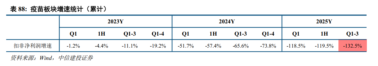 2025年前三季度及25Q3疫苗板块收入及利润端同比大幅下滑:2025年前三季度,疫苗板块收入同比下降52.5%,归母净利润同比下降121.6%,扣非归母净利润同比下降132.5%;其中25Q3疫苗板块营业收入同比下降27.5%,归母净利润同比下降196.7%,扣非归母净利润同比下降245.3%。