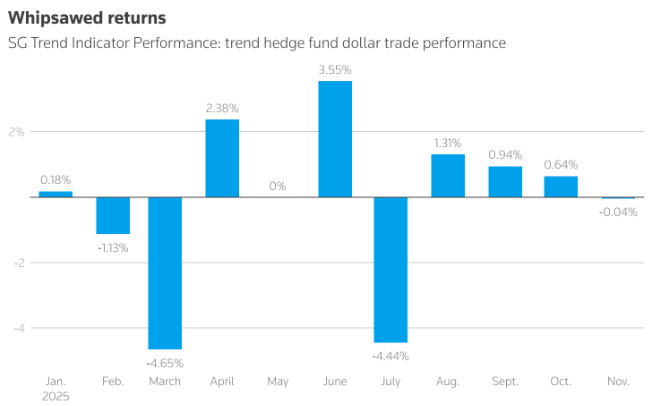 2025 年可谓是波折起伏的一年,发达市场货币的波动率在 4 月份飙升至两年来的高位;随后有所缓和,一个更加稳定的市场使得套利交易(即借入低收益货币以投资于高收益货币)更具吸引力。外汇市场的高波动性给对冲基金带来了盈利机会。例如,一位知情人士表示,管理着 10 亿美元资产的对冲基金EDL Capital今年增值了28%,年初和所谓的“解放日”期间的收益以及对美元的押注起到了推动作用。