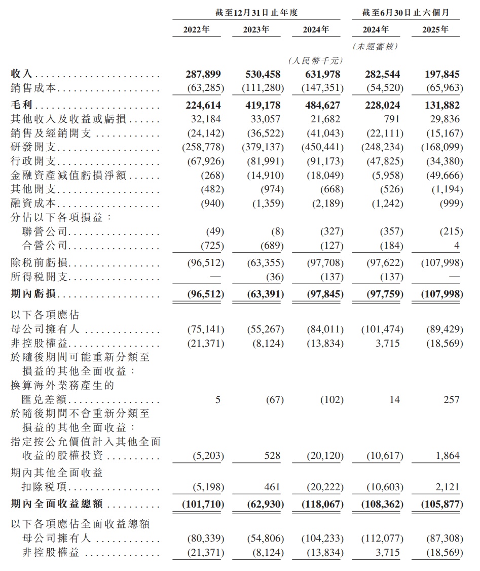 财务方面,于2022年度、2023年度、2024年度、2024年及2025年截至6月30日止六个月,迅策科技实现收入分别约为2.88亿元、5.30亿元、6.32亿元、2.83亿元、1.98亿元人民币;同期,期内亏损分别约为9651.2万元、6339.1万元、9784.5万元、9775.9万元、约1.08亿元人民币。