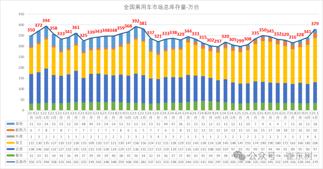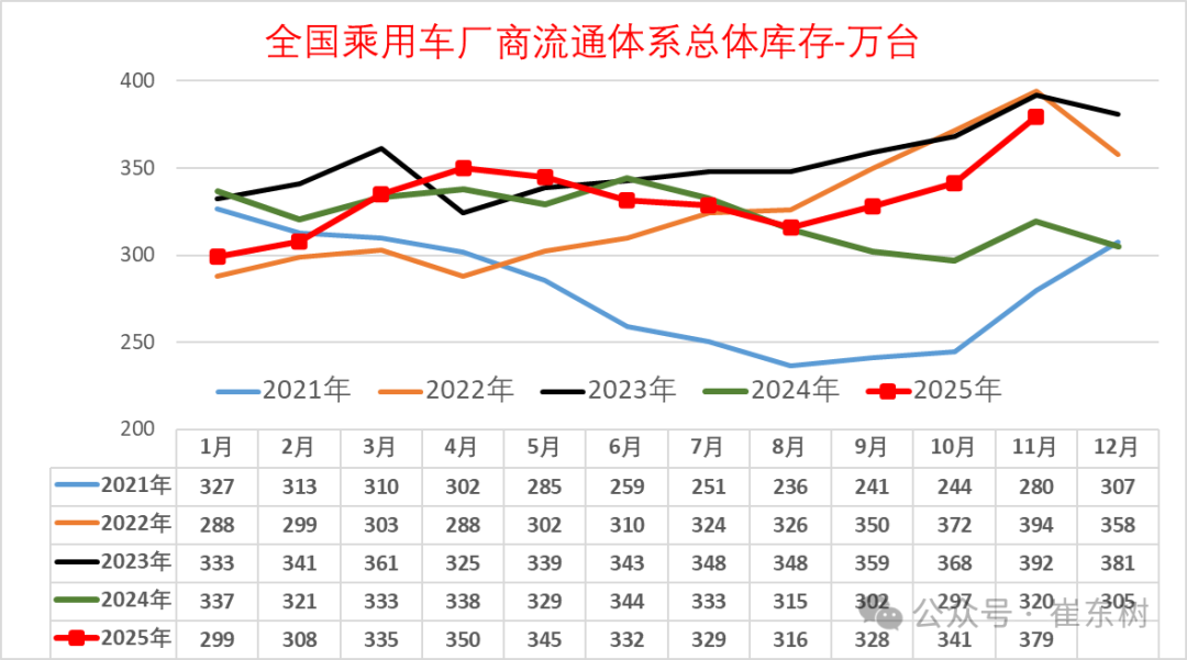 智通财经APP获悉,崔东树发文称,由于10-11月车市表现一般,11月库存回升到379万辆的较高状态。11月月末全国乘用车行业库存379万辆,较上月增38万辆,较2024年11月增59万辆,形成库存回升的旺季备货特征。