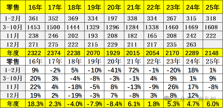 2024年乘用车国内零售前低后高,7-12月出现持续上升态势。2025年车市前低中高特征,1月由于春节前置等因素较弱,今年国内车市零售累计增速从1月的负12%持续拉升到1-6月的11%,7-11月呈现高基数的逐步减速特征,市场走出“前低中高后平”的走势。今年7-9月的零售同比增长平稳,10-11月在高基数下表现较弱。
