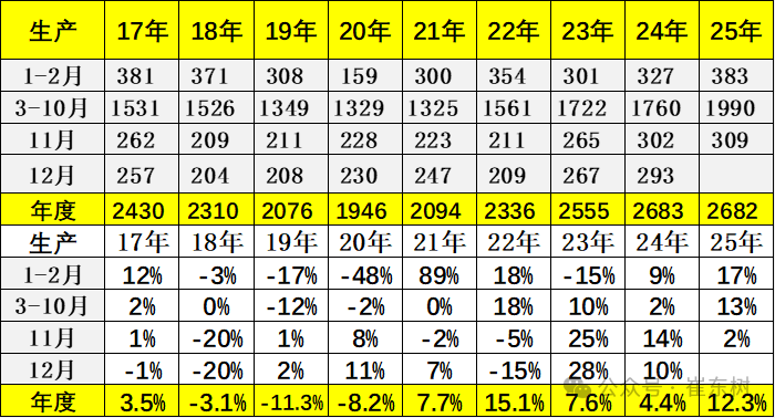11月乘用车生产309万辆,同比增长2%,环比增长5%。1-11月乘用车生产2682万辆,累计同比增长12%。