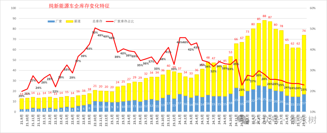 从仅生产新能源车企业的库存变化特征分析看,随着反内卷的推动,行业库存9月降到62万辆,11月行业库存上升到74万辆,较峰值库存降14万辆,但较10月增加12万辆。近期面临市场低于预期的风险,行业库存总体压力较大。