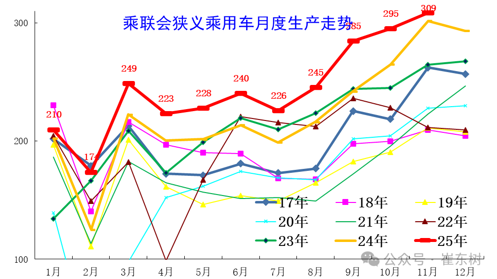 11月乘用车生产持续拉升,市场需求跟不上生产的拉升,11月乘用车生产309万辆,较历史同期高点2024年11月的302万辆高出7万辆,生产走势平稳。