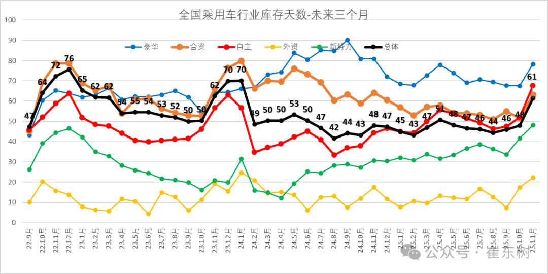 随着2025年市场回暖的如期到来,生产走势较强,前期的去库存的特征改变,4月末的库存天数明显上升,随后反内卷带来行业库存控制。随着中央促消费政策的推动,免税政策的到期预期,各地车展等营销活动活跃,预计未来几个月厂家总销量相对较好,因此根据2025年11月底的库存与未来销量综合预估的现有库存支撑未来销售天数在61天,相对于2023年11月的62天、2024年11月的48天,今年11月的总体库存压力相对较大。