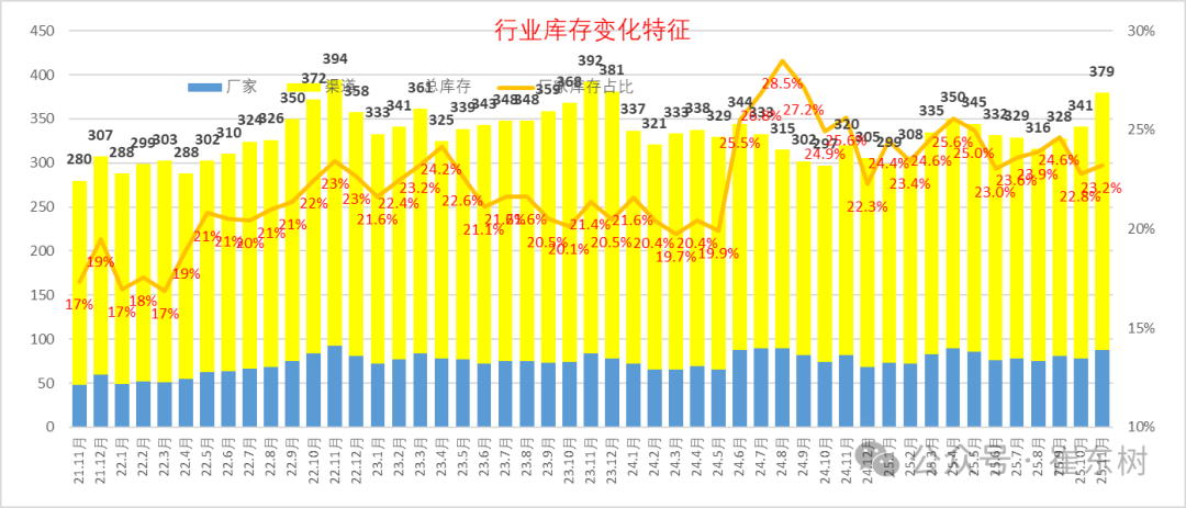 根据2025年11月底的库存与未来3个月销量综合预估,现有库存支撑未来销售天数在61天,而 2024年11月为48天,今年11月的总体库存压力相对较大。