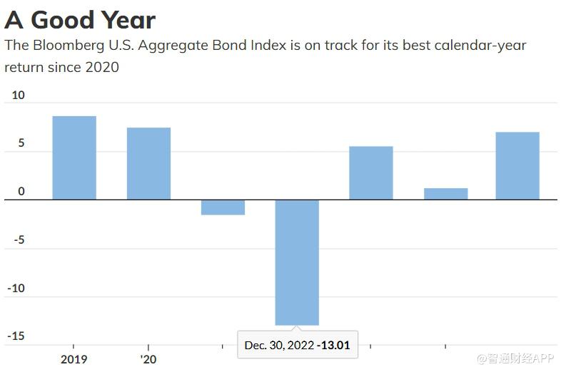 智通财经APP获悉,数据显示,截至周四,美国综合债券指数2025年累计回报已超过7%。该指数覆盖美国国债、政府相关债券、公司债以及抵押贷款支持证券和资产支持证券。相比之下,该指数在2024年的回报率仅为1.25%,2023年为5.5%。这一轮反弹发生在债券投资者仍努力走出历史性低谷之后,2022年,美联储为遏制通胀实施近40年来最快的加息周期,导致该指数当年下跌逾13%,创下有记录以来最差表现。