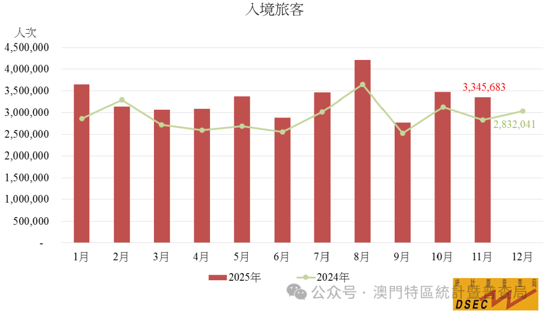 按入境渠道统计,11月经陆路(2,753,786人次,占总数82.3%)入境的旅客按年上升21.4%,其中经关闸和横琴口岸入境的旅客分别录得30.4%及57.0%增幅。经海路(328,691人次,占9.8%)及经空路(263,206人次,占7.9%)入境的旅客同比分别上升5.1%及4.9%。