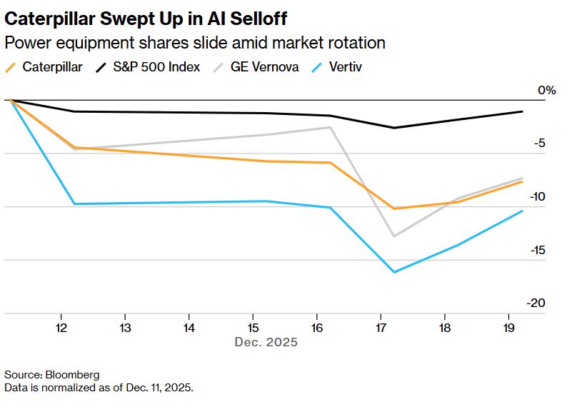 以下的图表显示,市场轮动之际动力设备股也难逃下跌态势,卡特彼勒与GE Vernova、Vertiv 则因自身被卷入AI抛售大浪潮而遭遇更加惨烈的跌幅。