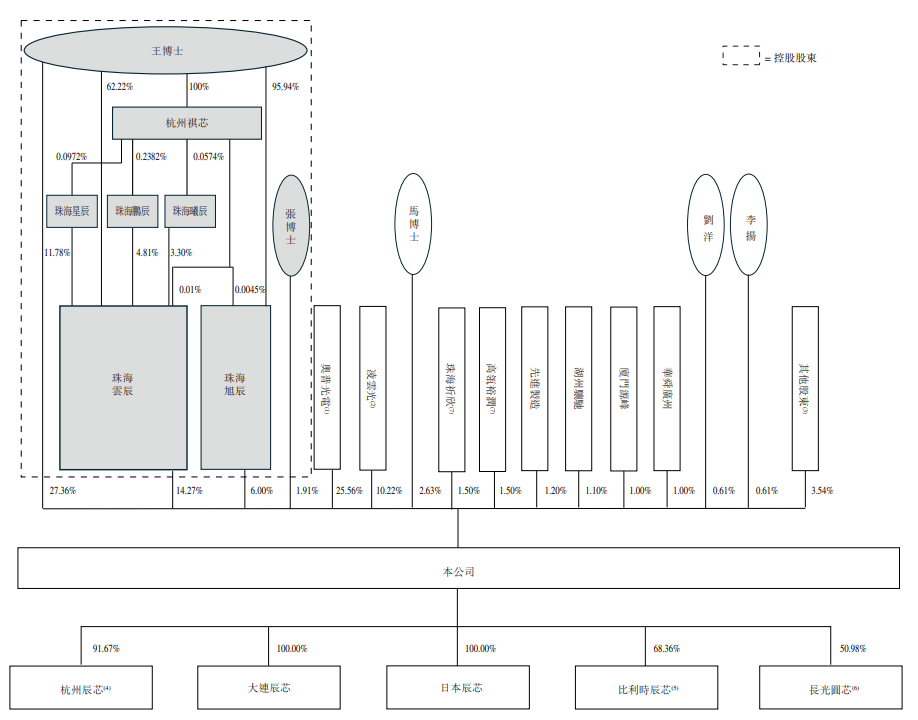 王欣洋博士直接持股27.36%,通过雇员持股平台珠海云辰和珠海旭辰分别持股14.27%和6.00%,王欣洋博士的配偶张艳霞博士持股1.91%,合计持股49.54%;奥普光电(002338.SZ)持股25.56%;凌云光(688400.SH)持股10.22%;马成博士、珠海祈欣、高瓴裕润等其他股东合计持股14.69%。