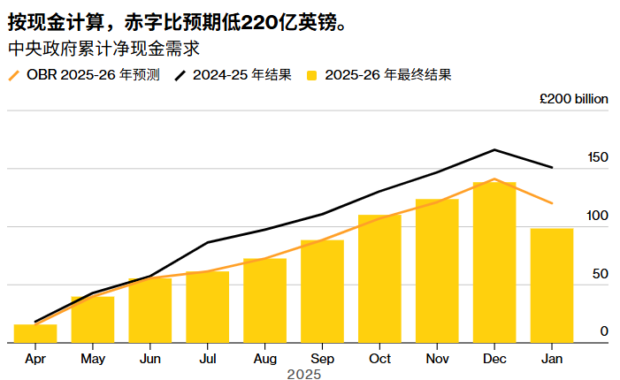 在2025-2026财年的前10个月,英国中央政府净现金需求——即财政部需要从债券市场筹集的资金以履行其支出承诺——低于1000亿英镑。而就在三个月前,预算责任办公室还预测会出现1200亿英镑的资金缺口。