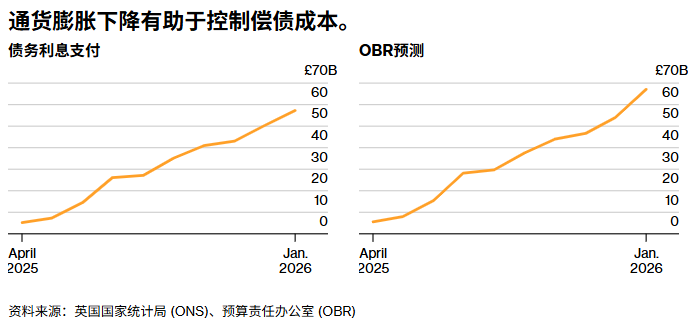 与此同时,在支出方面,由于通胀低于预期,导致与通胀挂钩的英国国债偿付成本下降,债务利息支出比预期低了近100亿英镑。不过,部分低于预期的支出可能会在本财年最后两个月有所回落。
