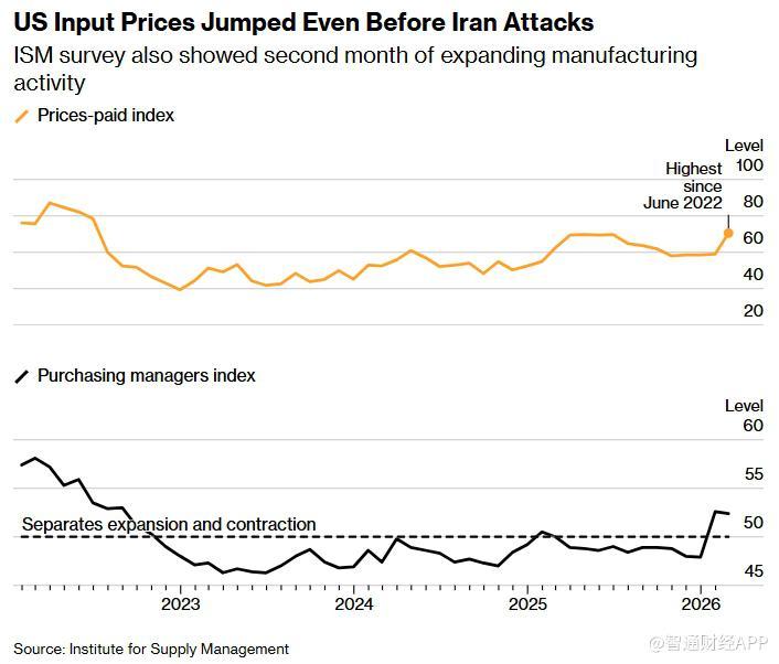 美国制造业2月延续扩张势头,但原材料成本以近三年来最快速度飙升,在美以对伊朗发动空袭之前,通胀回潮的担忧已明显升温。