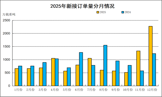 2025年,全国造船完工量5369万载重吨,同比增长11.4%;新接订单量10782万载重吨,同比下降4.6%。12月底,手持订单量27442万载重吨,同比增长31.5%。