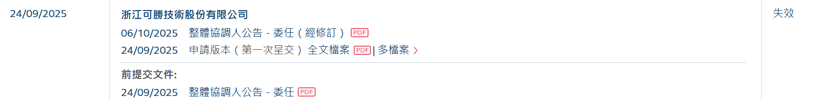智通财经APP获悉,浙江可胜技术股份有限公司(简称:可胜技术)于2025年9月24日所递交的港股招股书满6个月,于2026年3月24日失效,递表时中信建投国际为其独家保荐人。
