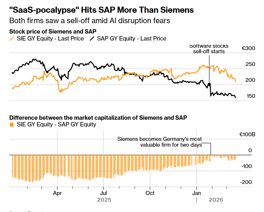 这家德国工业超级巨头拥有海尼根、台积电、强生和丰田等多元化的大型制造业客户,并且近年来通过大型收购不断加码软件业务。这使得公司被一些投资者认为更容易受到AI将如何颠覆商业模式这一广泛担忧的冲击。总部位于德国的欧洲最大规模软件公司SAP SE自年初以来已蒸发约四分之一市值。相比之下西门子下跌约10%,并且2月以来绝大多数跌幅已经被收复。