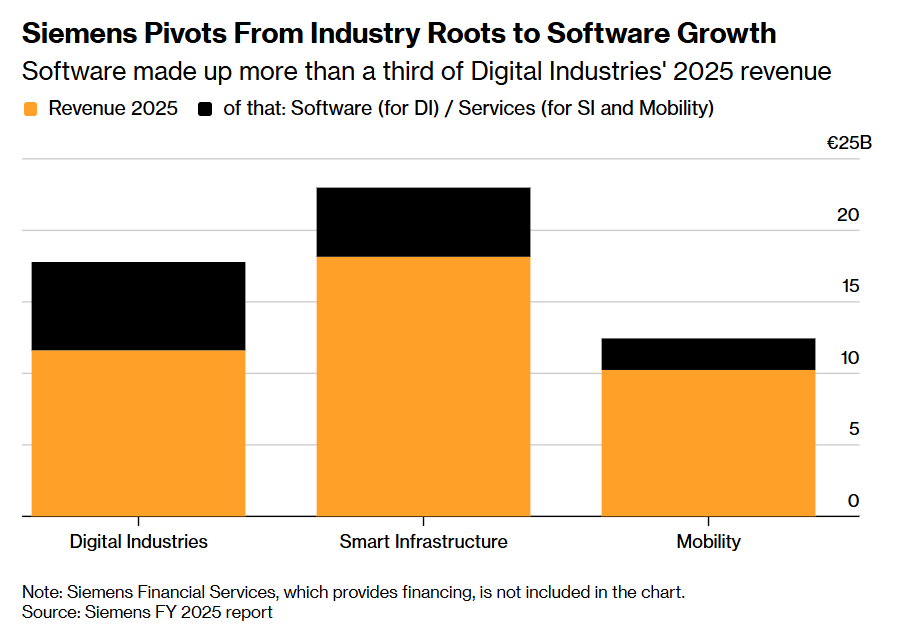如上图所示,西门子正从工业根基转向软件增长——软件在数字工业部门2025财年营收中的占比超过三分之一。