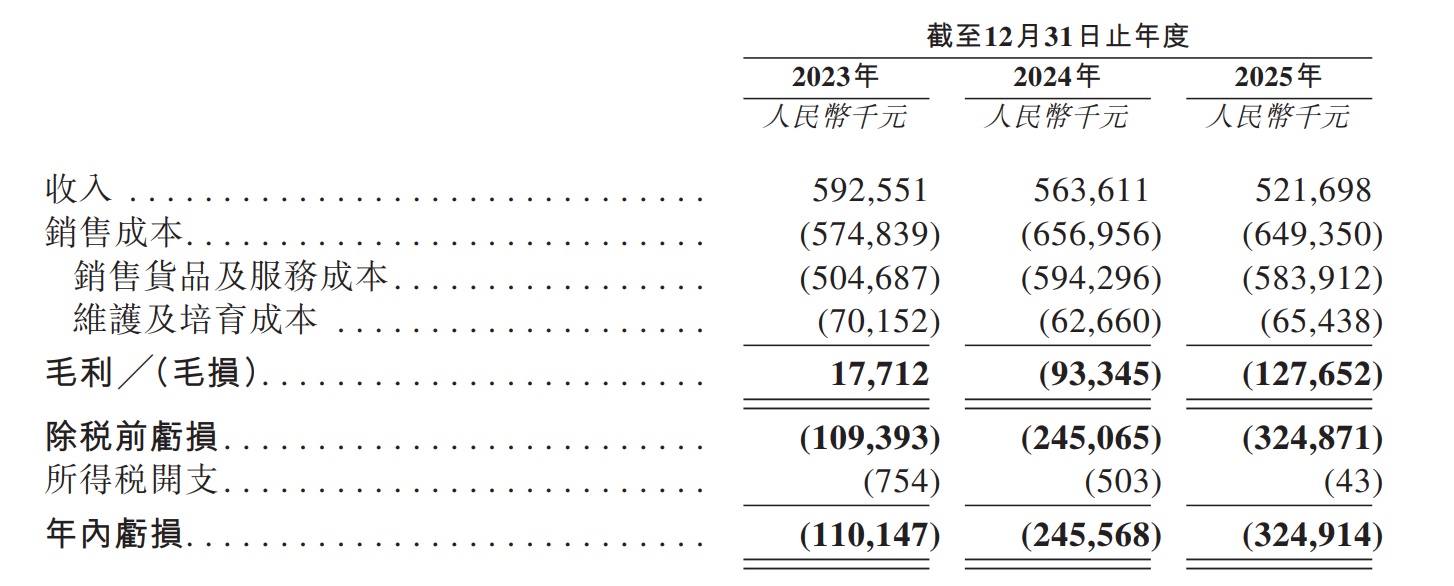 于2023年度、2024年度、2025年度,公司年内亏损分别约1.10亿元、2.46亿元、3.25亿元。