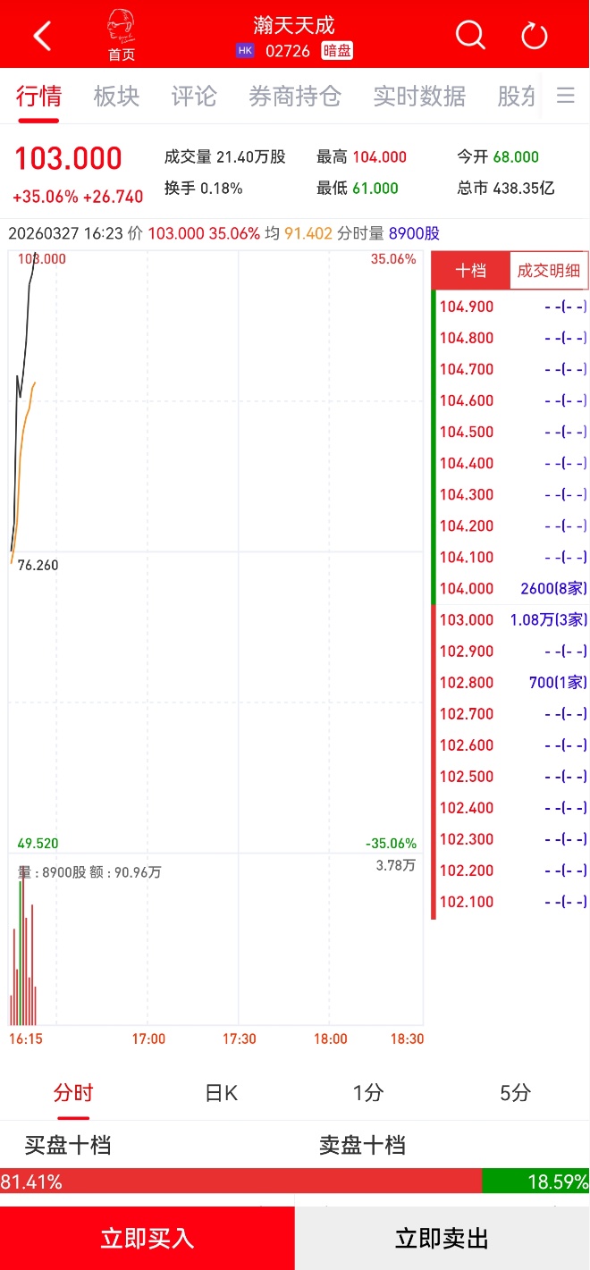 智通财经APP获悉,瀚天天成(02726)将于3月30日(下周一)在香港挂牌。截至发稿,利弗莫尔证券暗盘交易显示报价103港元,较招股价76.26港元上涨35.06%,每手50股,不计手续费,每手赚1337港元。