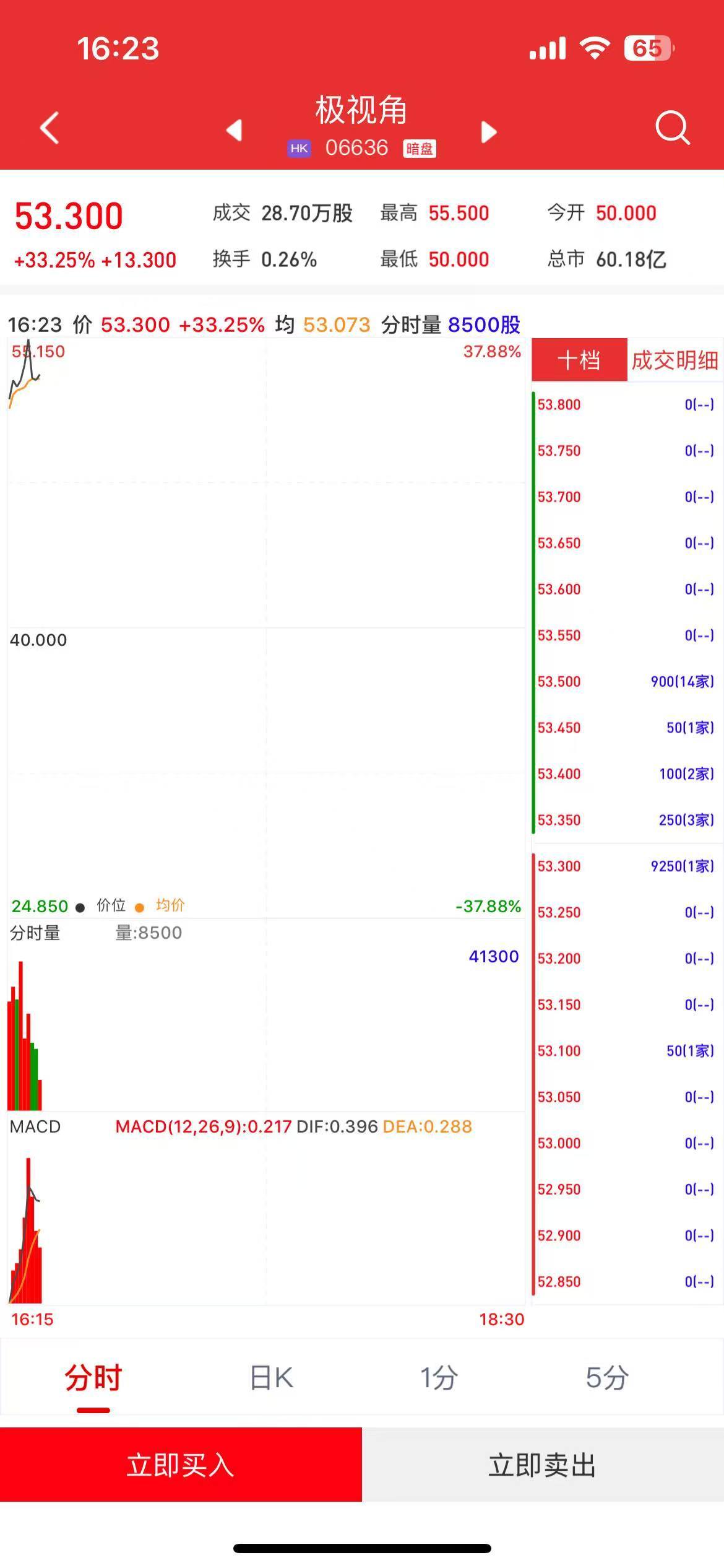 智通财经APP获悉,极视角(06636)将于3月30日(周一)在香港挂牌。截至发稿,利弗莫尔证券暗盘交易显示报价53.30港元,较招股价40港元上涨33.25%,每手50股,不计手续费,每手赚665港元。