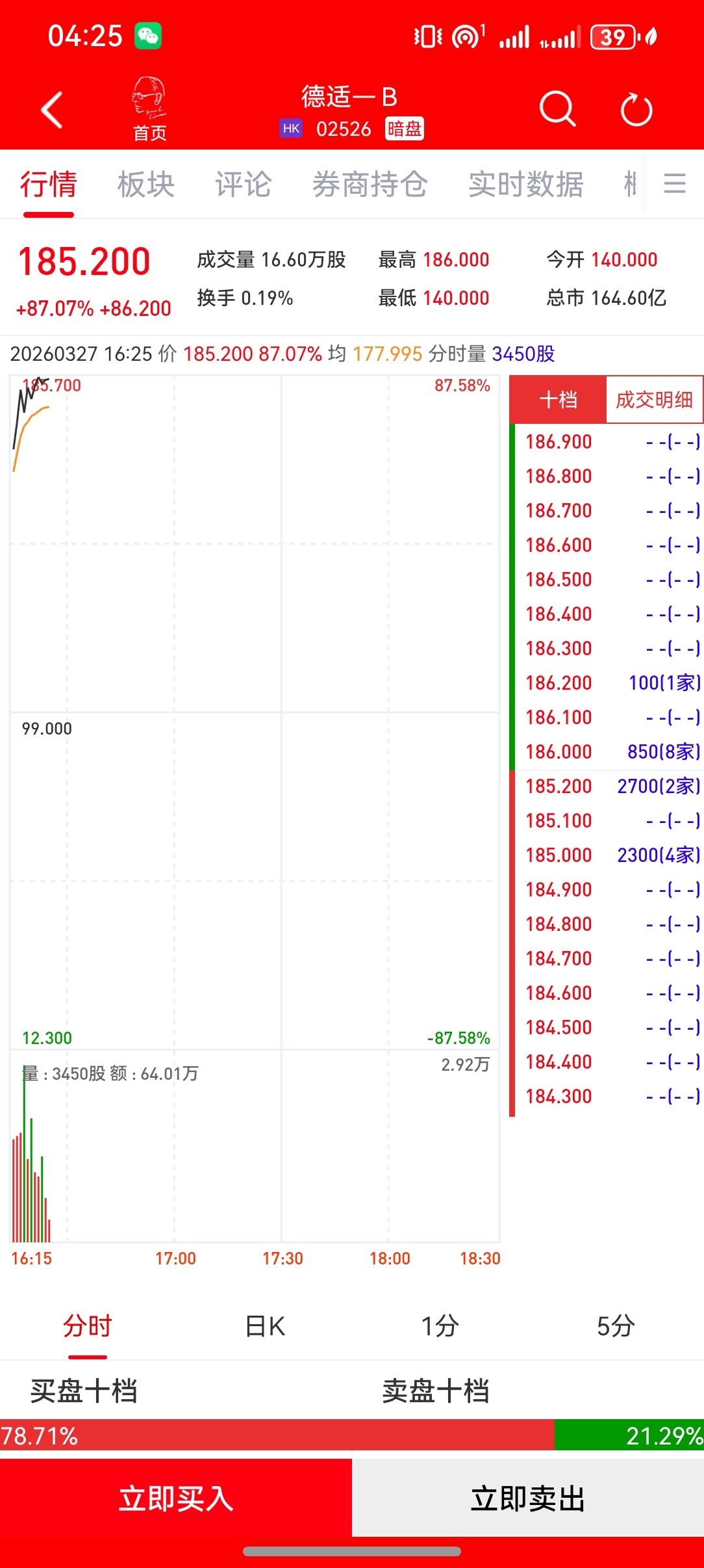 智通财经APP获悉,德适-B(02526)将于3月30日(下周一)在香港挂牌。截至发稿,利弗莫尔证券暗盘交易显示报价185.2港元,较招股价99港元上涨87.07%,每手50股,不计手续费,每手赚4310港元。