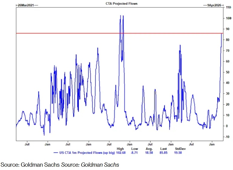 数据显示,趋势跟踪资金(CTA)本月已累计抛售约550亿美元美股,目前净空头规模达184亿美元。高盛认为,除非出现新的宏观冲击,这一轮系统性抛售“已接近尾声”,而市场风险收益结构正逐步向上倾斜。