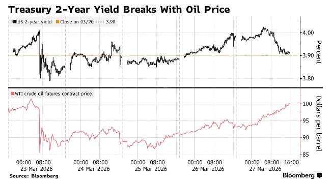 尽管WTI原油期货合约收于每桶99.64美元,创下2022年中期以来最高水平,短期国债收益率仍维持在当日低位附近。全球基准布伦特原油同样收于多年高点。