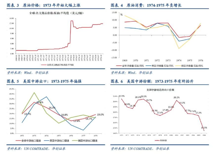 对于彼时的制造强国(美国与德国,全球出口份额前二,差距较小),两国中游制造均受益,但美国中游制造受益程度好于德国。1972年(危机前),美国中游份额为19.0%,1973-1975年,美国中游份额平均达到19.8%,份额提升幅度达到0.8%。对于德国,1972年的中游份额为 19.5%,1973-1975年平均达到19.8%,份额提升幅度为0.3%。从原油消费来看,德国受冲击幅度更大,1974-1975年全球原油消费负增长的年份,德国原油消费增速均值低于美国2.62个百分点。