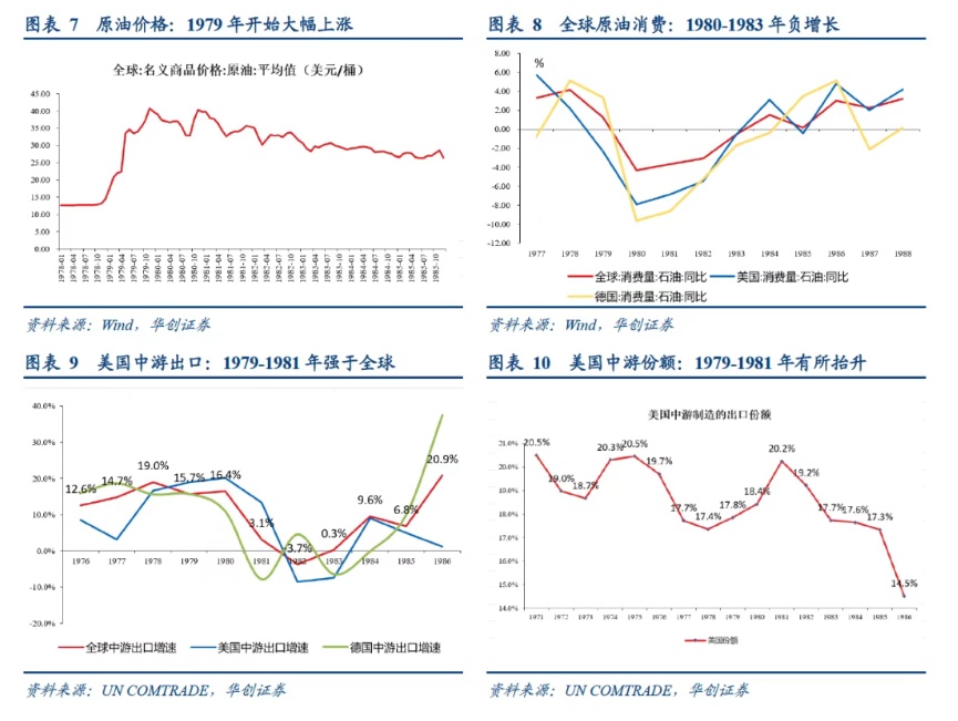 对于彼时的制造强国,美国中游制造份额提升,德国受损。1978年(危机前),美国中游份额为17.4%,1979-1981年,美国中游份额平均达到18.8%,份额提升幅度达到1.4%。对于德国,1978年的中游份额为 19.2%,1979-1981年平均达到17.9%,份额回落。从原油消费来看,1979-1980年全球原油消费负增长的年份,德国原油消费增速均值低于美国1.75个百分点。