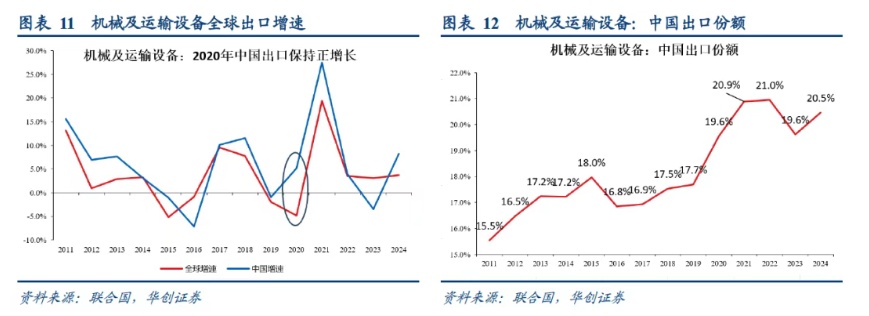 参考疫情,疫情对于全球供给格局影响较大。以机械及运输设备为例,2020年全球总需求减少,增速为-4.8%,是2016年以来增速最低的一年。但中国的机械及运输设备出口增速达到5.2%。体现到份额上,中国的机械及运输设备份额从2019年的17.7%提升到2020年的19.6%。疫情结束后,尽管份额有所波动,但始终在19%-21%区间波动,远高于2019年的17.7%。