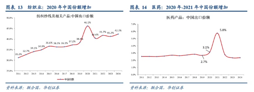 中国受益于全球需求增加。纺织用品,2020年中国出口增速为28.9%,全球份额从2019年的38.4%提升到2020年的46.1%。医药用品,2020-2021年中国出口增速分别为28%、120.6%。全球份额从2019年的2.7%提升到2021年的5.8%。