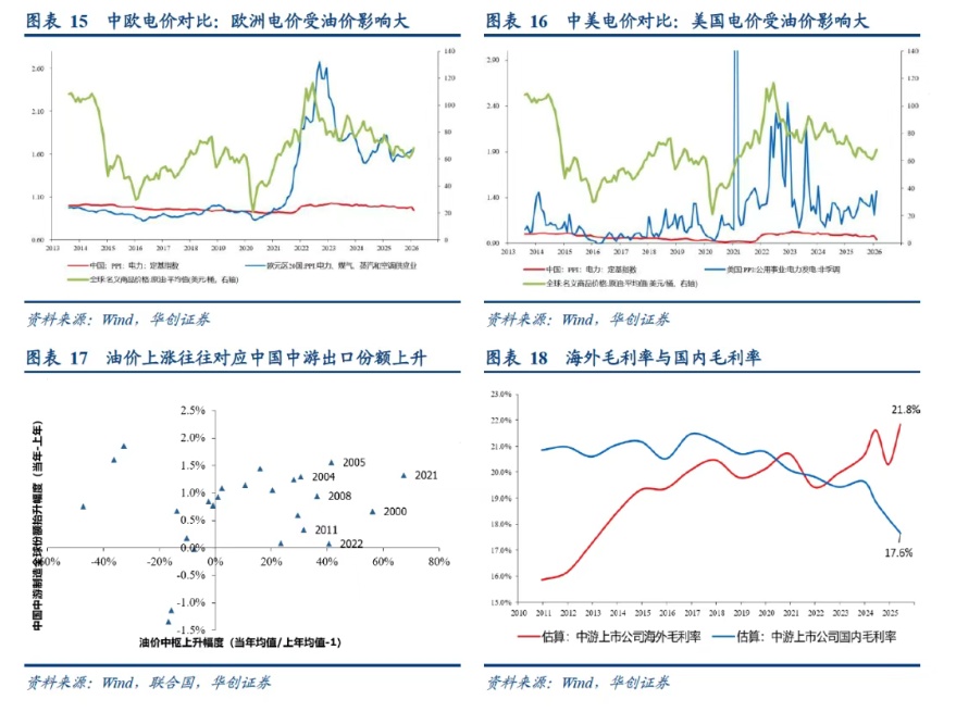 此外,考虑到中游制造企业海外毛利率大幅高于国内,叠加中游制造业企业在海外相比海外产能成本优势更大(油价上行),份额提升或更加顺畅(既有主动出口的动力,又有开拓市场的成本优势)。