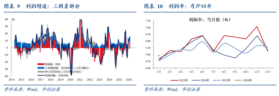 量、价、利润率拆分来看,量价双升。PPI同比,1-2月累计同比为-1.2%,去年12月为-1.9%。工业增加值1-2月增速为6.3%,去年12月为5.2%;收入端1-2月增速为5.3%,去年12月为-3.2%。利润率方面,1-2月为4.92%,去年同期(可比口径)为4.49%。利润率拆分来看,1-2月毛利率为15.2%,去年同期为14.9%;费用率8.66%,去年同期为8.56%;其他损益收入比为1.58%,去年同期为1.80%。