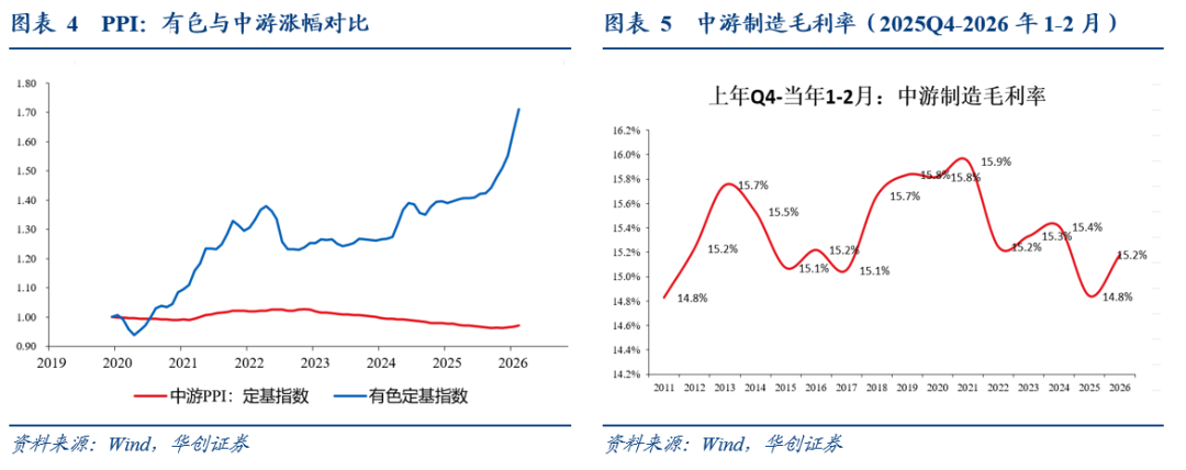 2025年10月以来,有色金属涨幅较大。以PPI有色矿产、PPI有色加工两大行业来看,整体的价格上涨幅度为18.6%(2025年10月-2026年2月),同期,中游制造业的PPI累计上涨幅度为0.9%。从中游制造业的成本端来看,有色采矿与有色加工合计的成本占全部成本之比为9%,因而有色金属的大幅上涨对其成本带来较大冲击。
