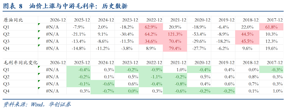 但,考虑到中游的成本中有色的权重更大,中国的电价受油价影响幅度低于海外可能带来出口份额增加,本轮高油价来自供给冲击可能带来更多的能源投资带动中游需求增加等因素,中游毛利率或更有韧性。
