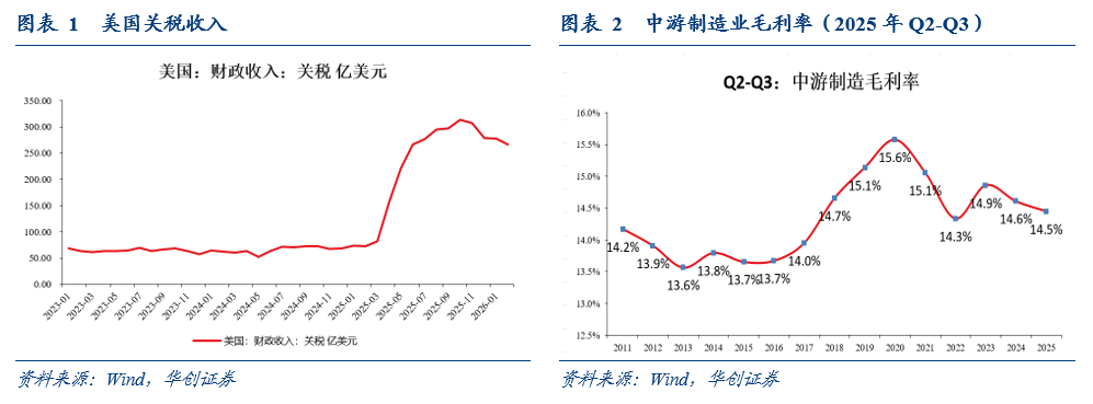 2025年4月开始,美国对全球大幅增加关税。从关税收入来看,去年3月为81.6亿美元,到去年9月,关税增加至296.7亿美元,随后到2026年2月,降至265.9亿美元。因而,可以认为,关税压力最大的时候,在2025年的Q2-Q3。