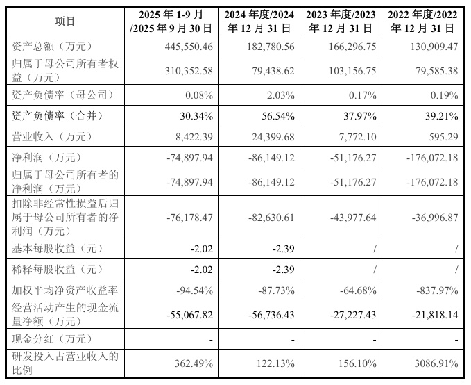 财务方面,于2022年度、2023年度、2024年度、2025年1-9月,公司实现营业收入分别约595.29万元、7772.10万元、2.44亿元、8422.39万元;同期,录得净亏损分别约17.61亿元、5.12亿元、8.61亿元、7.49亿元。