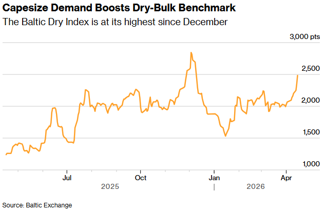智通财经APP注意到,由于需求激增及船舶供应收紧,一项衡量散装货运费率的关键指标已攀升至去年 12 月初以来的最高水平。周三,伦敦波罗的海干散货运价指数(BDI)上涨 5.5% 至 2,484 点,连续第九个交易日走高。