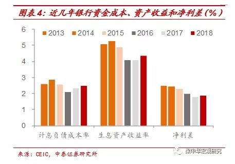 而银行加点的多少很大程度上又由银行的资金成本和风险偏好决定。2016年以来,尽管基准贷款利率未再变化,但市场利率经历了先上后下的过程,当前银行间资金利率、同业存单利率和银行发债融资利率都还略高于2016年的低位。所以我们统计的几十家银行的负债端平均成本在2.5%附近,仍比2016年高很多,在这种情况下要预期LPR利率比当时低很多似乎不太现实。而且最近几年银行资产端和负债端的利差也在收窄,利润空间被压缩,这也会导致LPR下行空间相对有限。