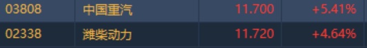 智通财经APP获悉,九月重卡销售数据超预期,获多家机构唱好,重卡概念股今日延续涨势,截至9时59分,中国重汽(03808)涨5.41%,报价11.7港元,潍柴动力(02338)涨4.64%,报11.72港元。