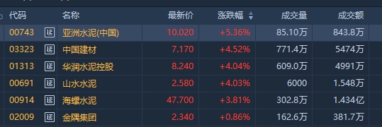 截至发稿,亚洲水泥(中国)(00743)涨5.99%,报10.08港元;西部水泥(02233)涨4.76%,报1.32港元;中国建材(03323)涨4.37%,报7.16港元;华润水泥(01313)涨4.17%,报8.25港元;海螺水泥(00914)涨3.92%,报47.75港元。